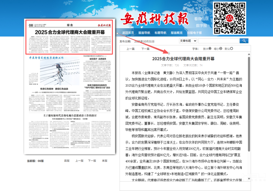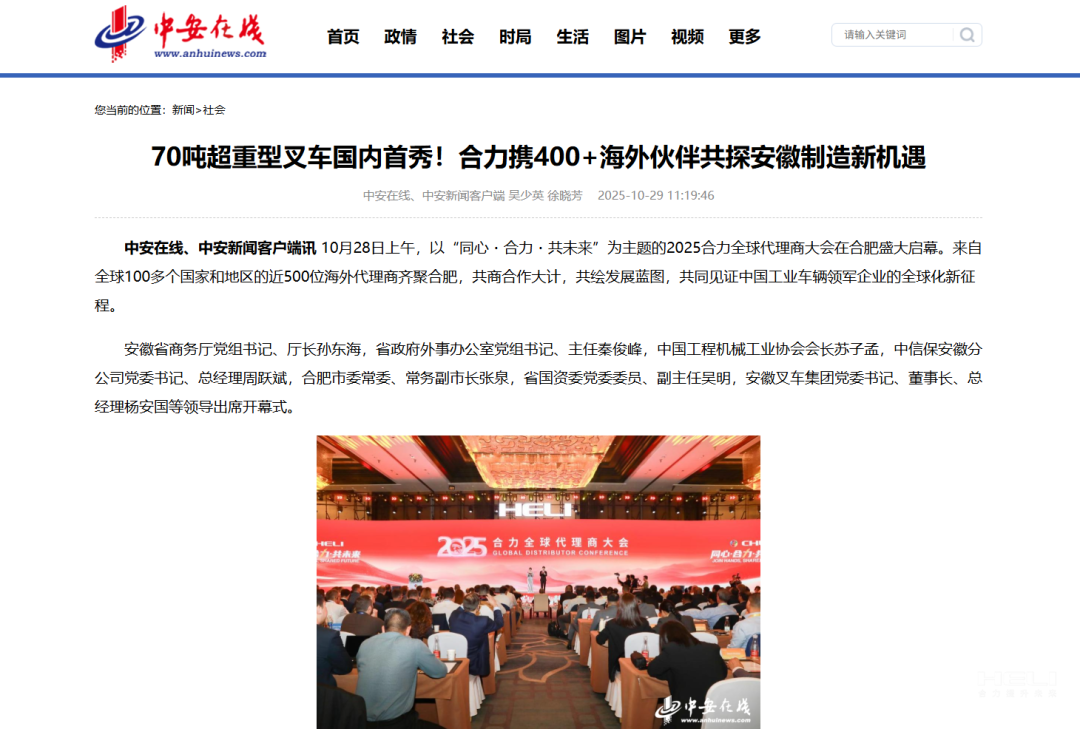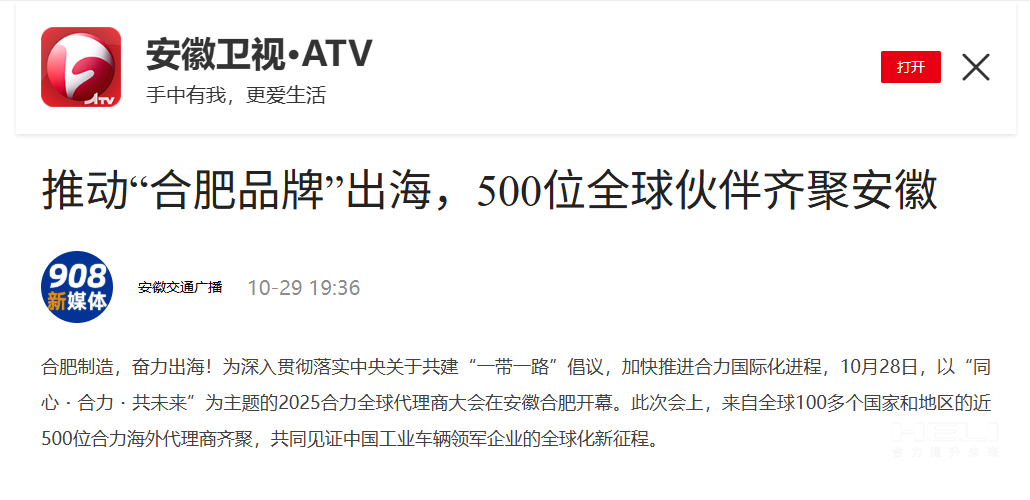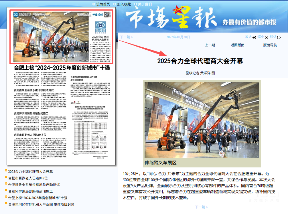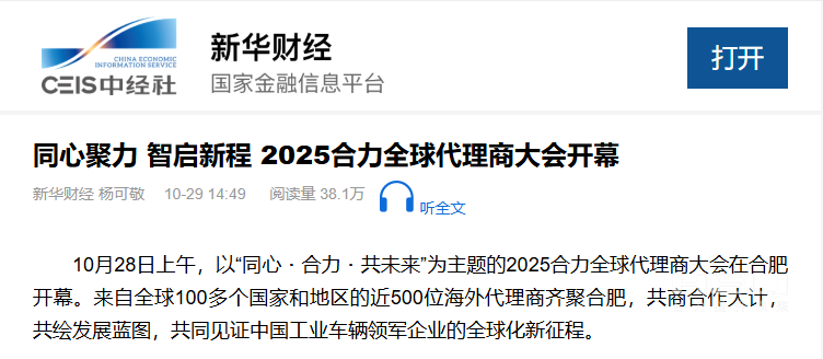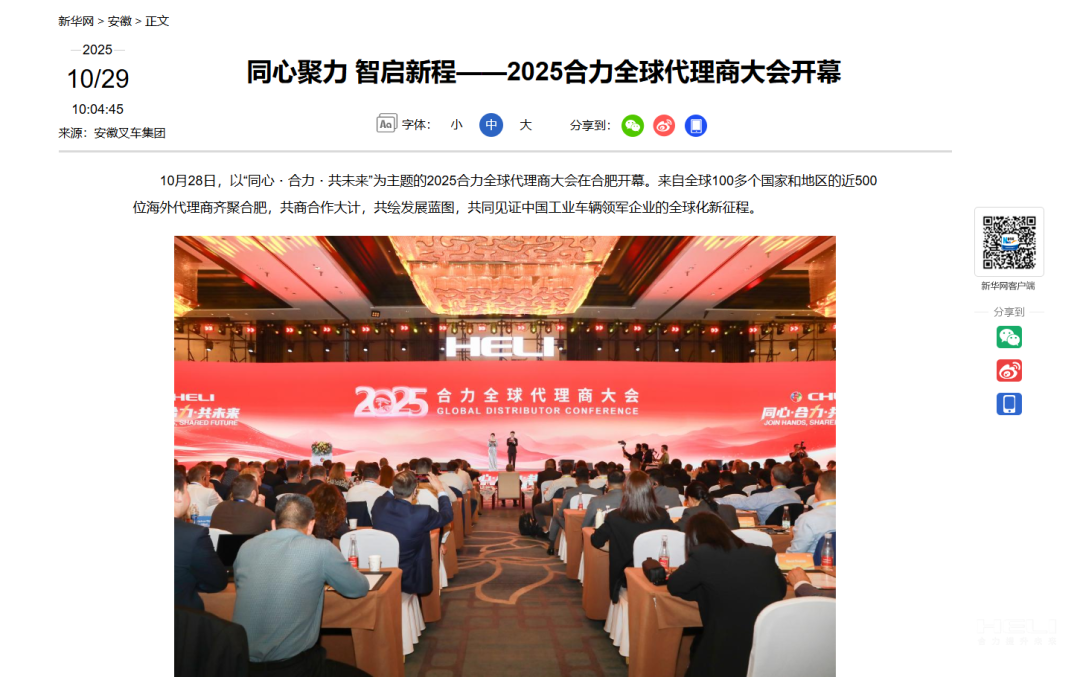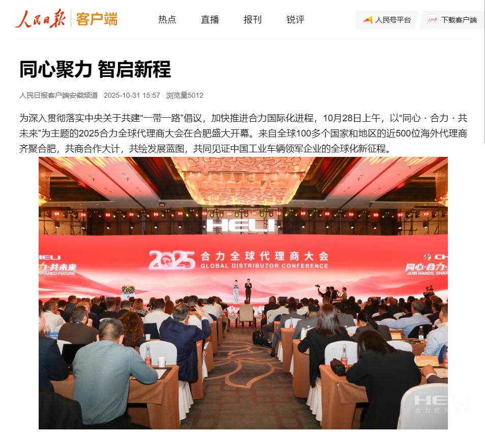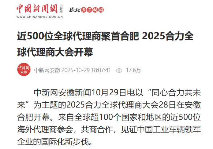 10月28日至31日,“同心?合力?共未來”2025合力全球代理商大會在合肥召開,引發(fā)媒體廣泛關(guān)注,新華社安徽分社、中央廣播電視臺安徽總站、經(jīng)濟日報、證券日報、央廣網(wǎng)、中國工業(yè)報、人民網(wǎng)安徽頻道、新華網(wǎng)安徽頻道、安徽日報、安徽新聞聯(lián)播等28家媒體、46名記者蒞臨現(xiàn)場。中央、省內(nèi)外及香港、行業(yè)媒體競相報道或轉(zhuǎn)載報道,內(nèi)容涵蓋戰(zhàn)略發(fā)布、智能成果及全球化布局,形式多元、視角鮮活,立體展現(xiàn)合力“智能+綠色”發(fā)展新動能,奏響高質(zhì)量發(fā)展強音。