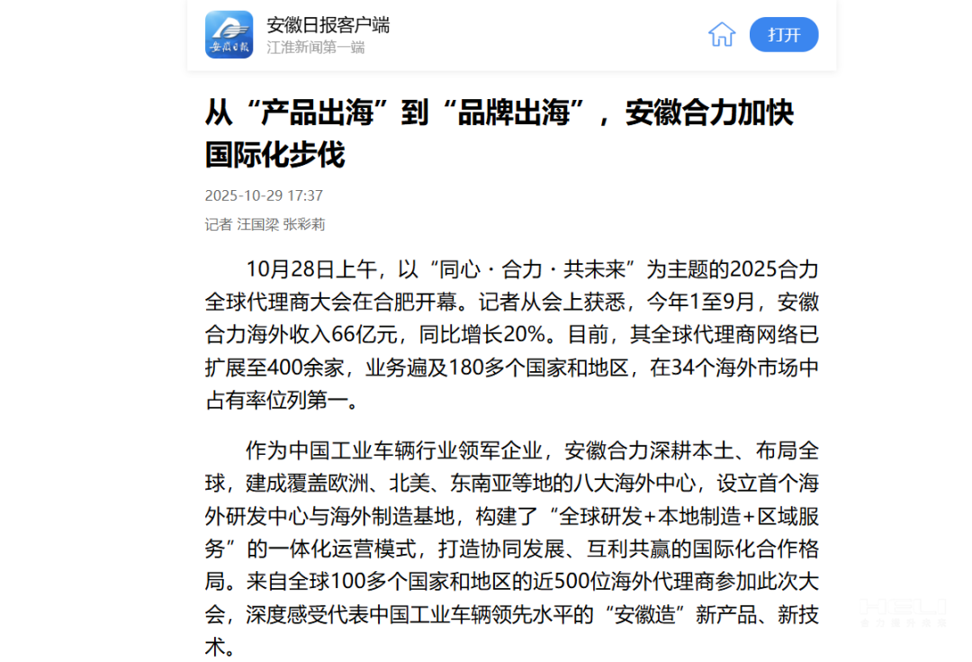 10月28日上午,以“同心?合力?共未來”為主題的2025合力全球代理商大會在合肥開幕。記者從會上獲悉,今年1至9月,安徽合力海外收入66億元,同比增長20%。目前,其全球代理商網(wǎng)絡(luò)已擴展至400余家,業(yè)務(wù)遍及180多個國家和地區(qū),在34個海外市場中占有率位列第一。